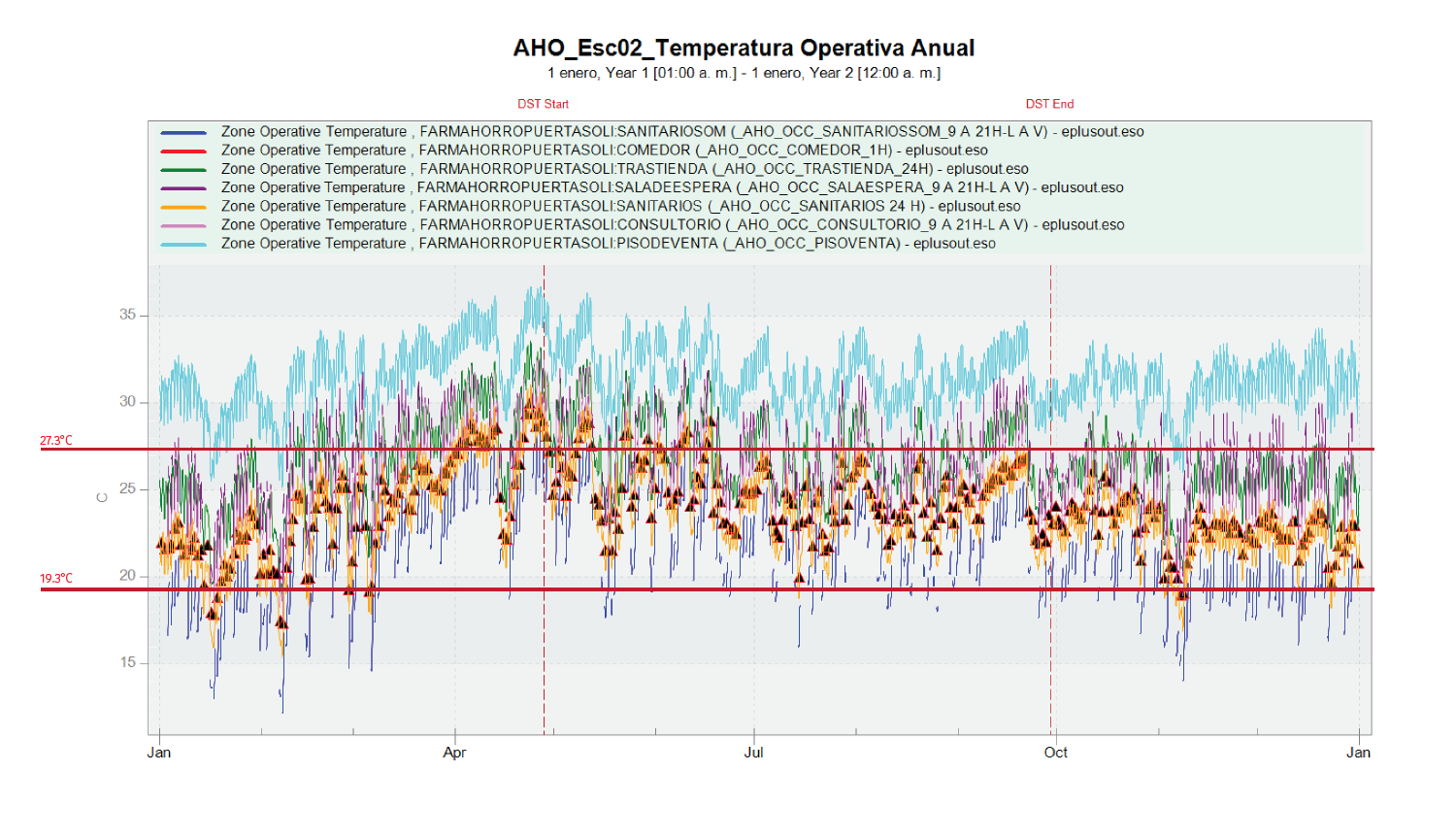 El estudio de confort se realiza teniendo en cuenta varios escenarios posibles a evaluar, con el fin de establecer una comparativa de confort PASIVO. Una simulación del edificio PASIVA, significa que los escenarios que se están simulando tienen desactivados los sistemas de climatización y la ventilación mecánica. Para estos análisis, únicamente se tienen en cuenta la arquitectura, orientaciones, materiales y especificaciones, espesores y acabados, horas de ocupación, programaciones de uso y ventilación natural. El objetivo de estas simulaciones es poder resolver el 100% del confort desde la propia arquitectura, sin tener que recurrir a sistemas de climatización. El % de disconfort que resulte, tendrá que ser cubierto con sistemas activos, ya sean de refrigeración o de calefacción.
