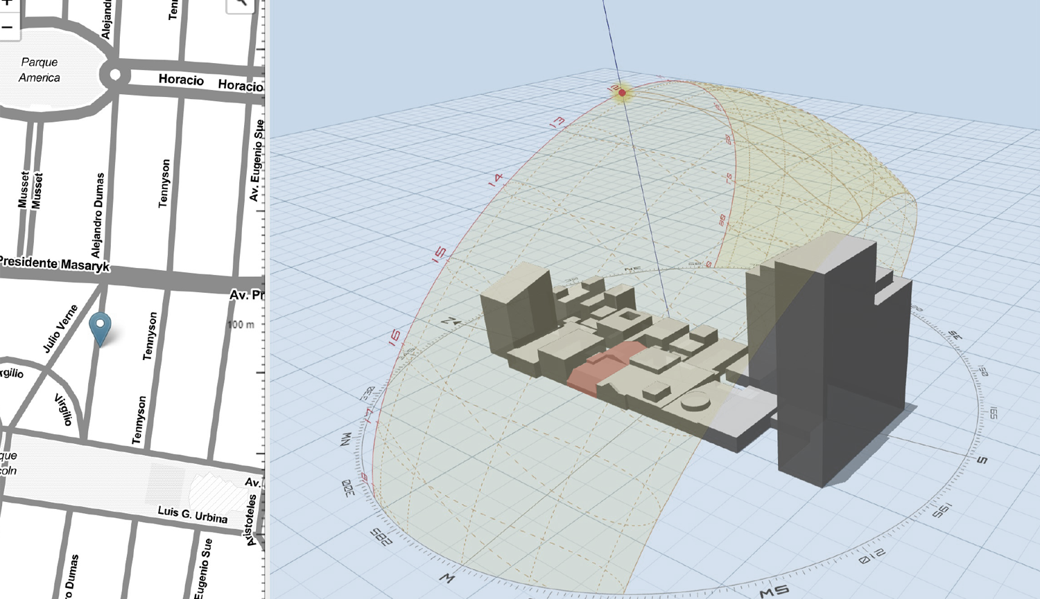 Se realiza el estudio bioclimático del entorno, para entender la influencia de las sombras en la cubierta de vidrio.