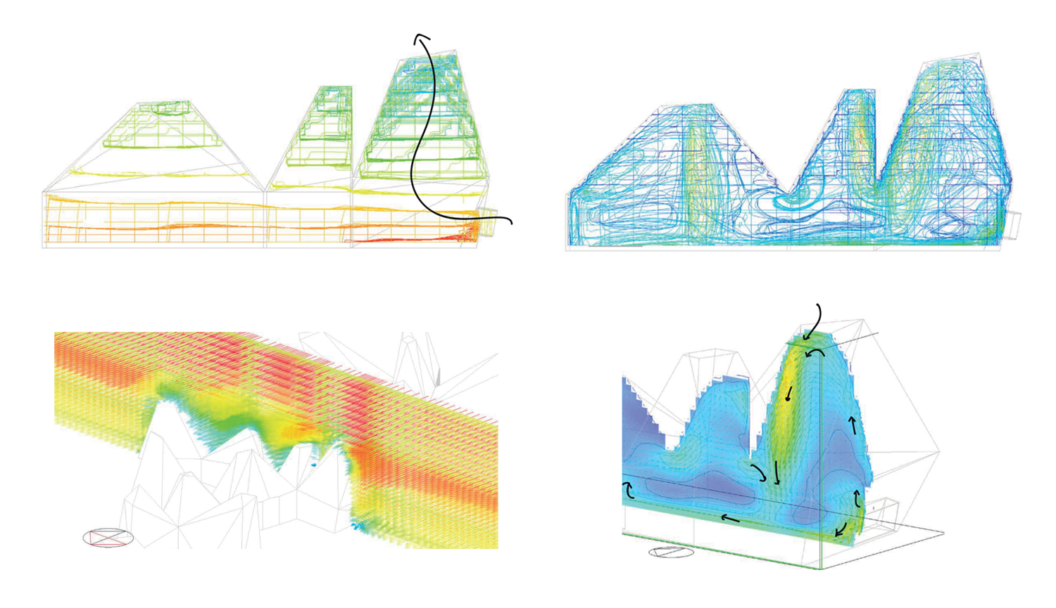 Se realizan todos los estudios en etapa de proyecto arquitectónico con el fin de entender el comportamiento pasivo de los materiales y espesores usados, así como de las chimeneas de ventilación propuestas y cómo afectan las mismas en las ganancias de calor, en la entrada de luz en los espacios y en la ventilación natural.