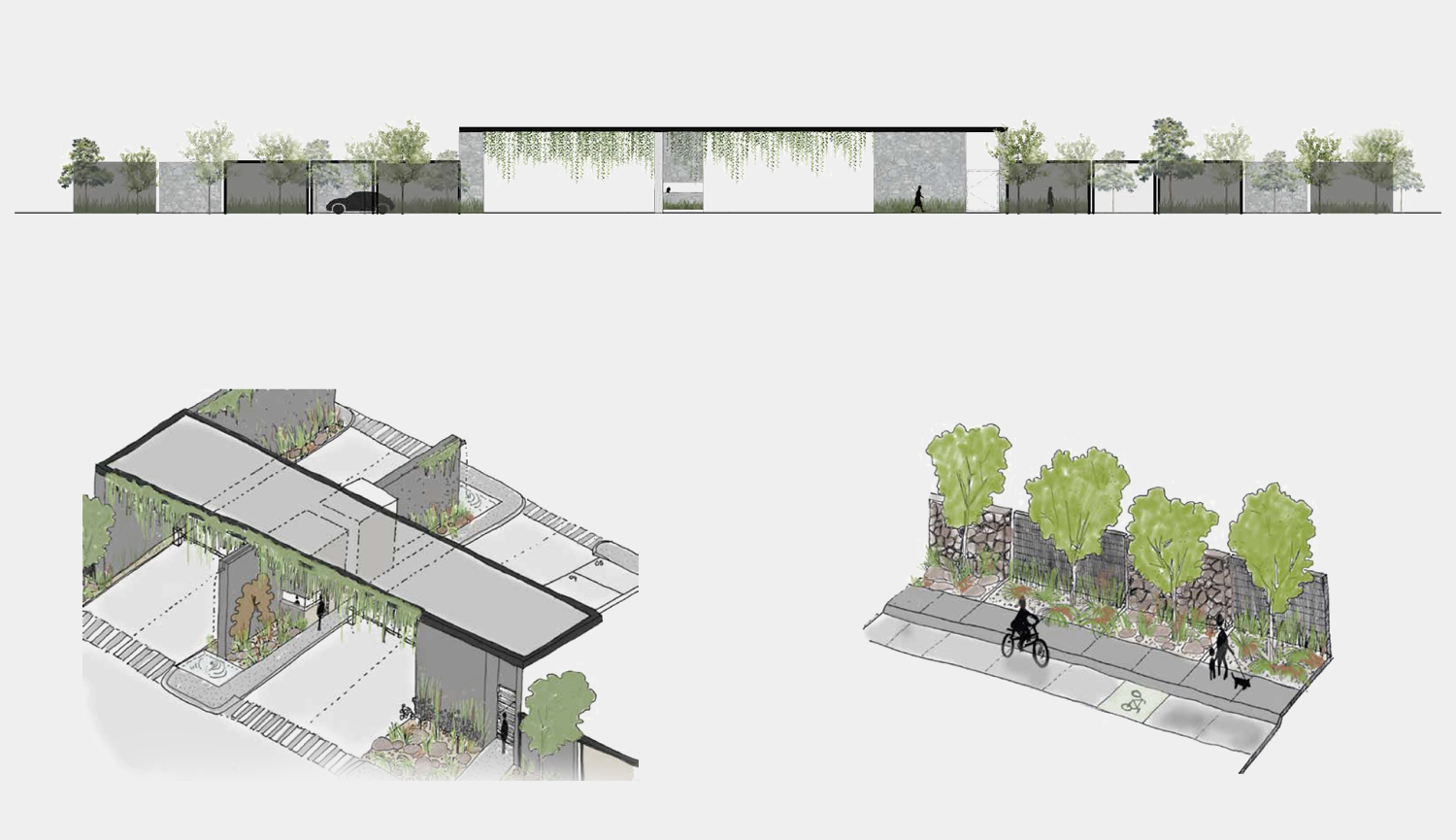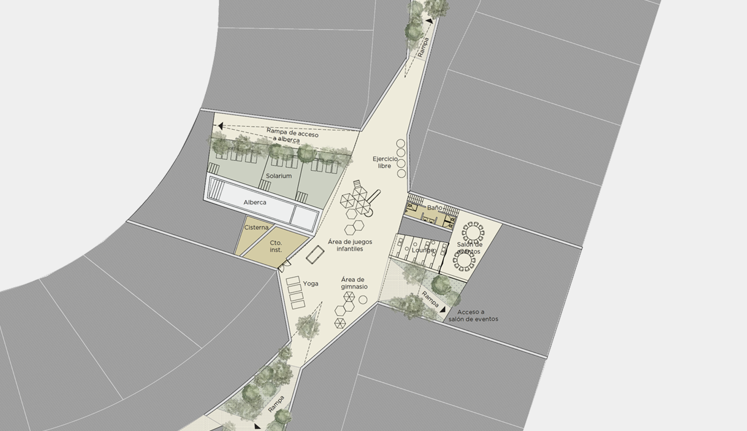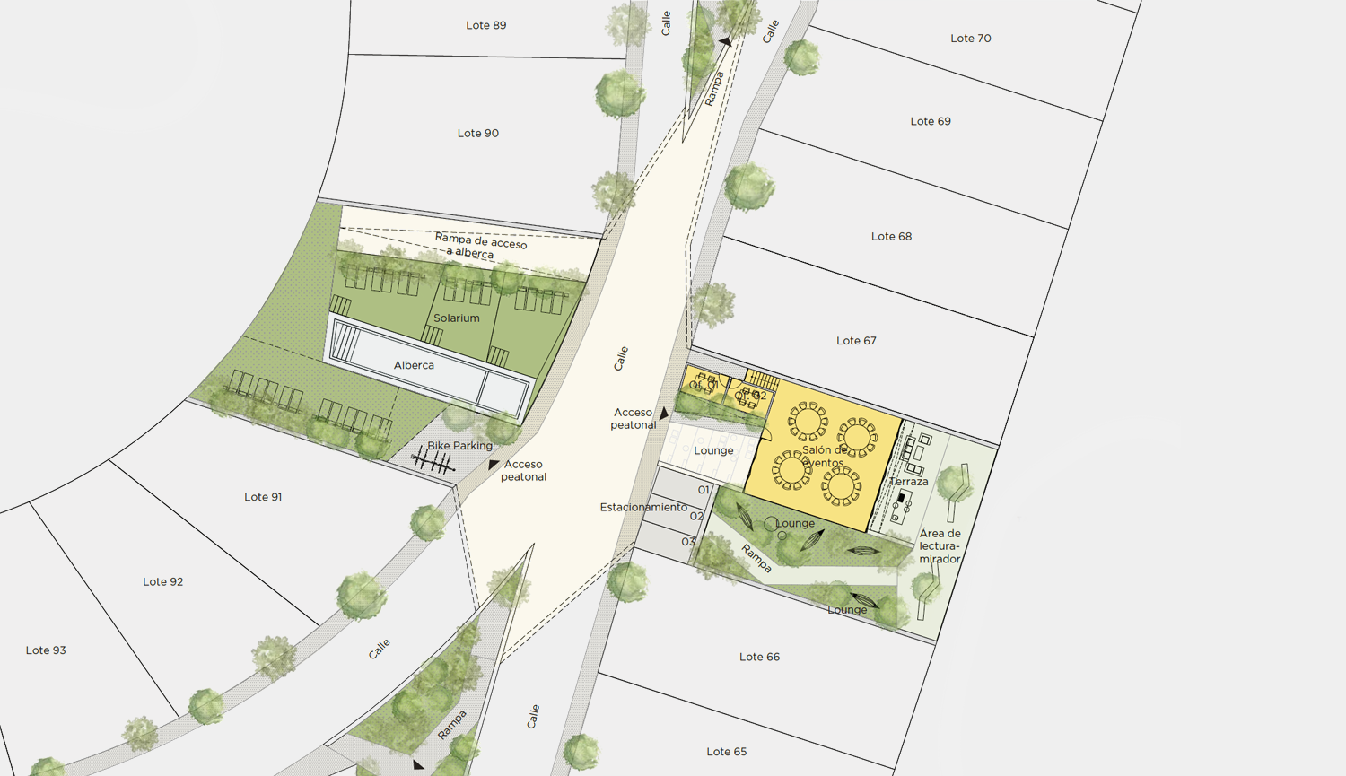 Viviendas con doble fachada, donde los árboles tienen una función fundamental: arbolar las principales vías de acceso, dar privacidad de unos lotes frente a otros, generar en las áreas traseras de las casas espacios verdes peatonales que permitan independizar las rutas caminando de las rutas vehiculares.