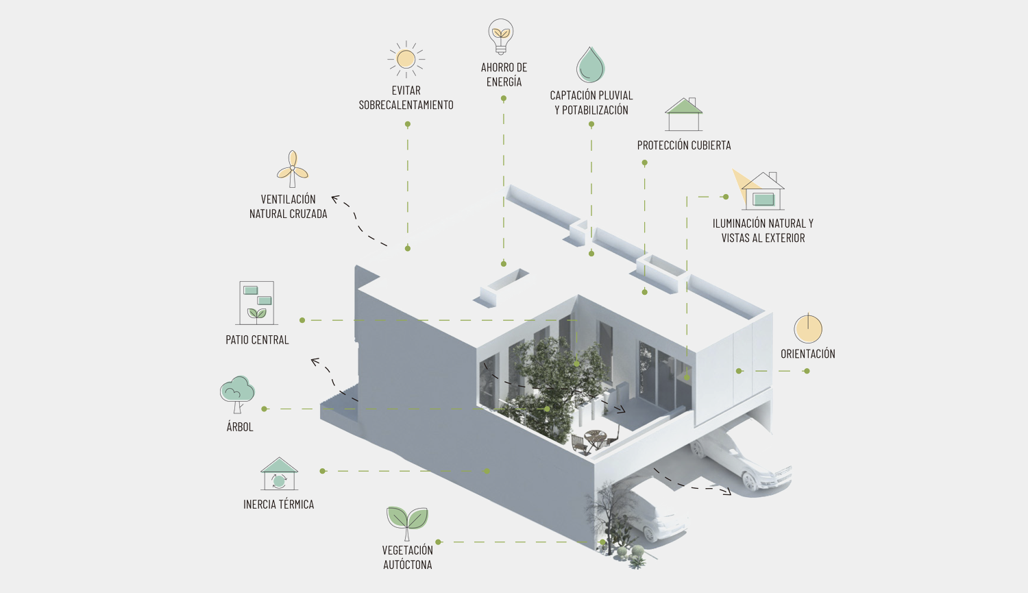 Regulación de la temperatura de la vivienda, refrescamiento diurno y nocturno, renovación del aire y conexión de los espacios aportando luz y privacidad.