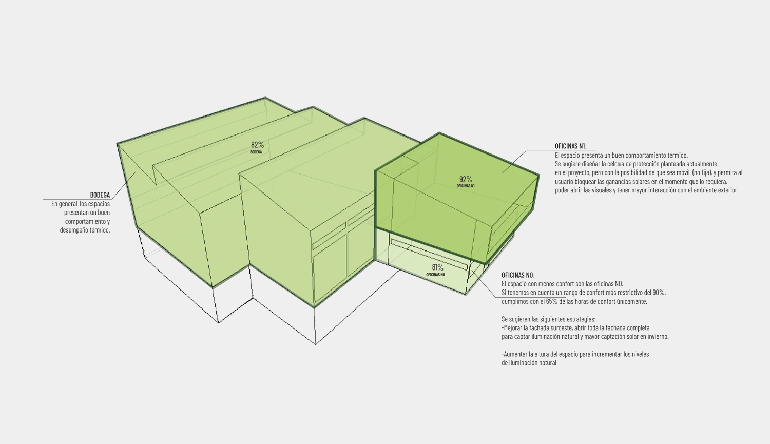 Para estos análisis, únicamente se tienen en cuenta la arquitectura, orientaciones, materiales y especificaciones, espesores y acabados, horas de ocupación, programaciones de uso y ventilación natural. El objetivo de estas simulaciones es poder resolver el 100% del confort desde la propia arquitectura, sin tener que recurrir a sistemas de climatización.