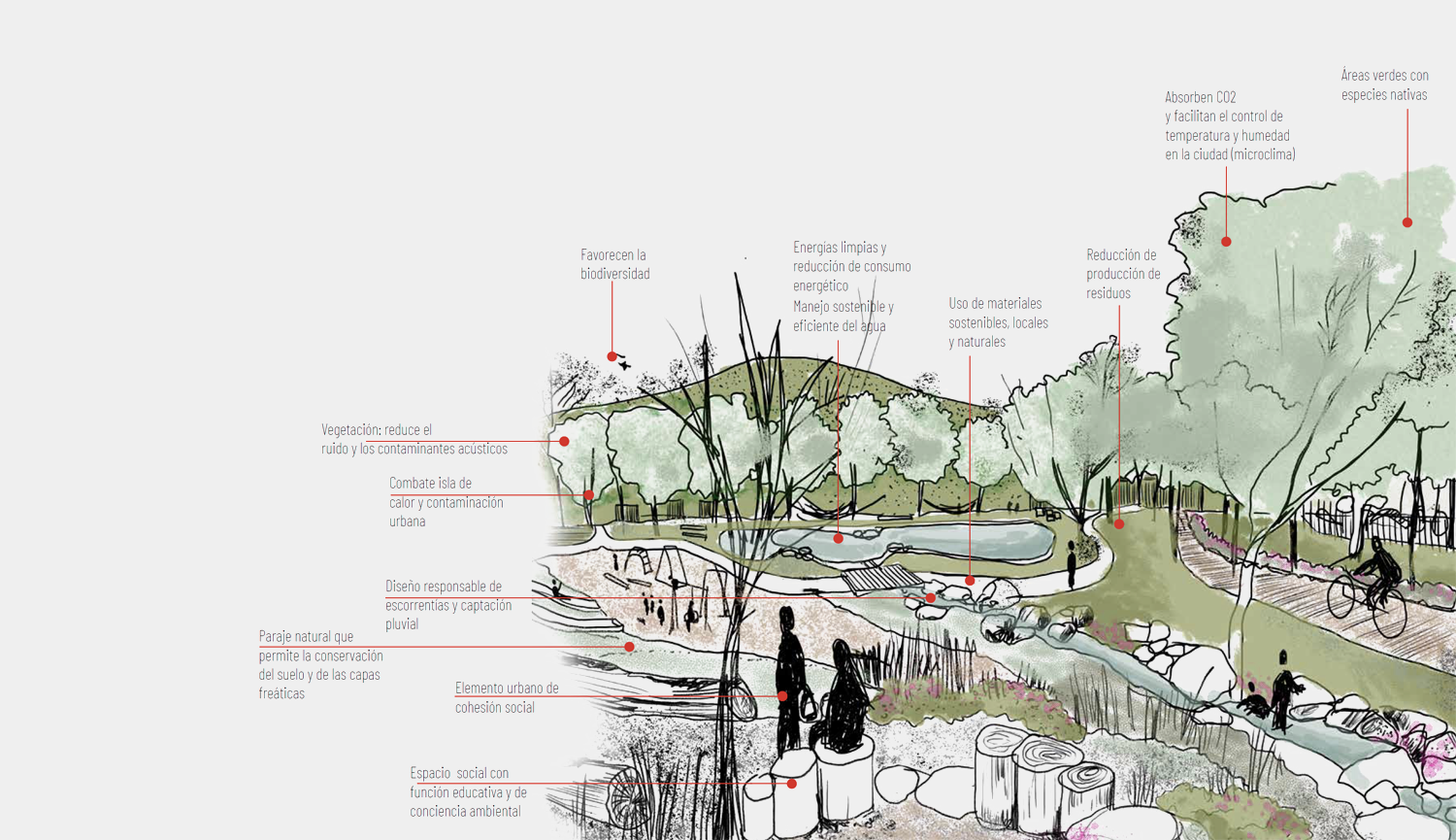 En este proyecto tuvimos la oportunidad de vivir la naturaleza durante todo el proceso de proyecto ya que realizamos un levantamiento visual, gráfico y fotográfico de todas las visuales, árboles, elementos existentes y topografía, que nos permitieron entender donde ubicar áreas de estancia, recorridos peatonales, el tránsito del agua y de los cauces naturales, las zonas de mayor y menor altura. Toda una experiencia que me gustaría compartir para que sigamos introduciendo bosques urbanos y espacios verdes con conciencia dentro de nuestras ciudades.