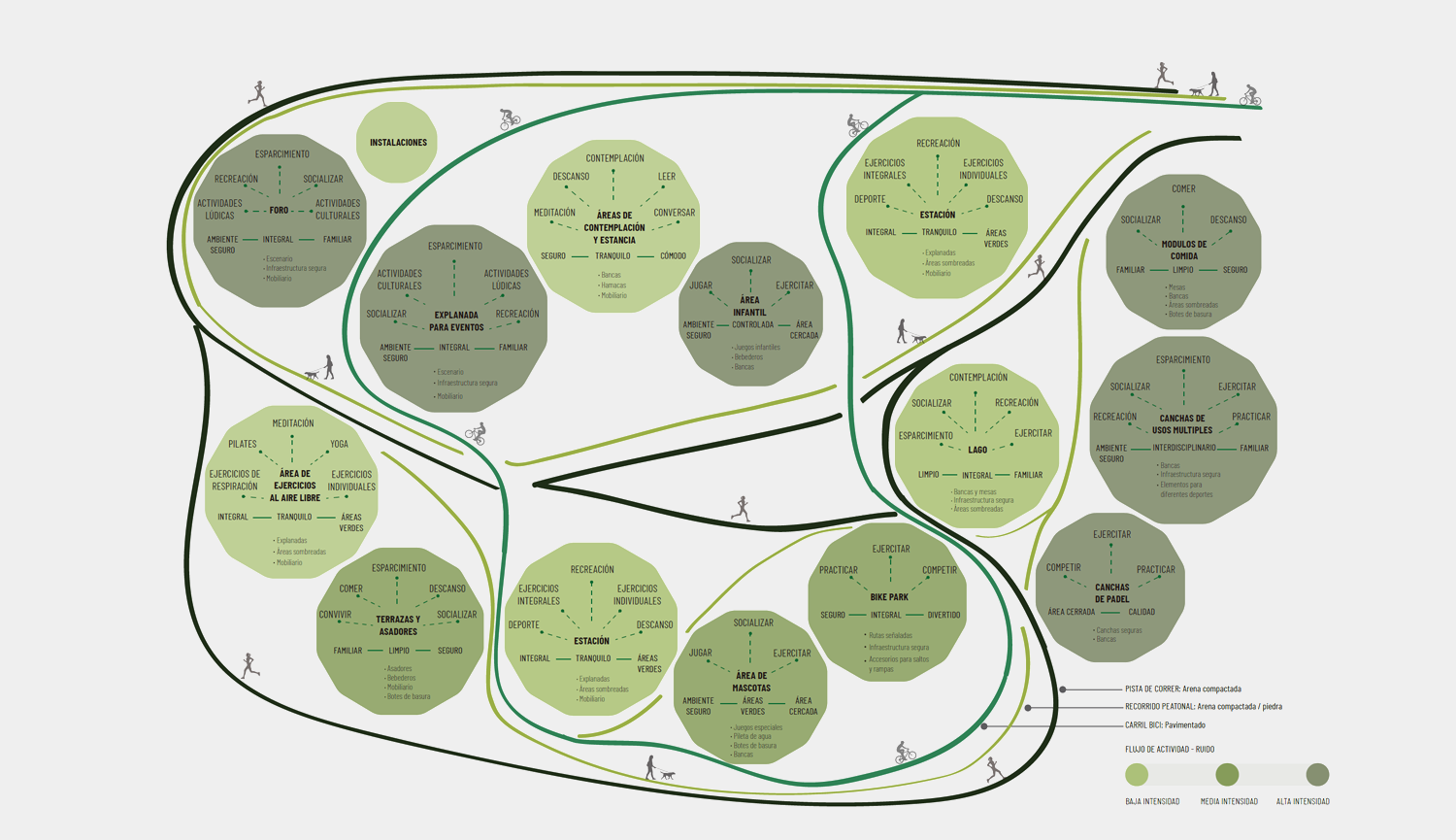 Este proyecto se trata de una plaza comercial itinerante en Zibatá. Se concibe el proyecto como un lugar dotado de pequeños negocios de productos sostenibles gastronómicos, de moda, de productos y servicios básicos que necesitamos día a día y con espacios de cowork que pretenden convivir con actividades deportivas, mascotas y crear una interacción natural y urbana con el parque donde se ubica, así como generar un valor agregado la sociedad. Pensado como un lugar en continua transformación, que no dañe el parque no se ubica, que permita realizar una vida al exterior, como un laberinto donde nos podemos perder y reencontrar, donde los niños y las familias encuentran un lugar al que pertenecen, un árbol, un helado, un pájaro, un cocinero que trabaja con los productos del huerto y la permacultura, un amigo haciendo yoga al aire libre, a mi mamá comprando un jugo saludable. Un espacio para todos donde poder perderme, aparecer y desaparecer, jugar y aprender, ver las montañas y descubrir el parque y la naturaleza que me rodea. Un lugar donde todo el desecho se aprovecha en las áreas verdes, donde toda la energía proviene de los techos solares, donde la estructura se recicla y reinventa, donde la naturaleza se pretende fusionar con nosotros y nosotros con ella.